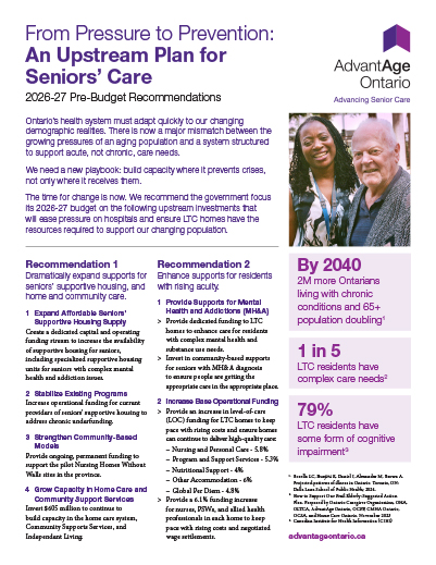 This submission represents a bold new perspective from AdvantAge Ontario: a system-wide view for seniors’ care that focuses on upstream solutions.